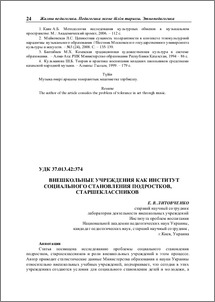 - Литовченко, О.В. (2013) Внешкольные учреждения как институт социального становления подростков, старшеклассников Доклады Казахской академии образования, 1 (2). pp. 24-31.
