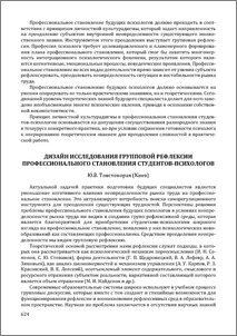 - Товстокора, Юлія Віталіївна (2013) Дизайн исследования групповой рефлексии профессионального становления студентов-психологов In: Психология - наука будущего. Материалы V Международной конференции молодых ученых 28‐29 ноября 2013 года . «Институт психологии РАН» , м.Москва, Росія, pp. 624-626. ISBN 978‐5‐9270‐0277‐1