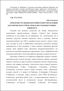 - Сліпчишин, Л.В. (2014) Problems and difficulties of preparation of future specialists for creative industries in the conditions of instability of market of employment In: Professional preparation of the future skilled workings . Сполом, м.Львів, Україна, pp. 86-89. ISBN 978-966-665-929-6