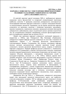 Описано стан народної словесності у другій половині ХІХ ст. у класичних університетах, де спостерігається тенденція оновлення змісту професійної підготовки майбутніх філологів та істориків у напрямі вивчення народної словесності на науково обґрунтованих засадах, з урахуванням ідей аналізу фольклору зарубіжними ученими.