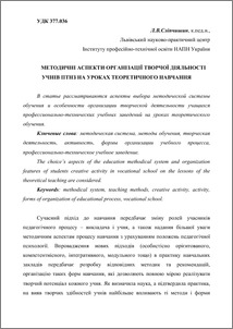 - Сліпчишин, Л.В. (2013) Methodical aspects of organization of creative activity of the students ПТНЗ on the lessons of theoretical studies New technologies of studies (76). pp. 218-223.