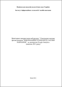 - Шиненко, М.А. and Ткаченко, В.А. (2011) Моніторинг використання веб-ресурсу " Електронне наукове фахове видання "Інформаційні технології і засоби навчання" за допомогою Google Analytics (жовтень 2011 року) [Experiment] (Unpublished)