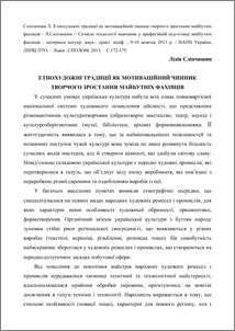 - Сліпчишин, Л.В. (2013) Ethnic artistical traditions as motivational factor of creative growth of future specialists In: Modern technologies of studies in professional preparation of future specialists . Spolom, L’viv scientific and practical center of Vocational Education National Academy of Pedagogical Sciences of Ukraine, м.Львів, Україна, pp. 172-175. ISBN 978-966-665-885-5