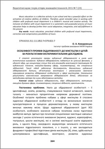 | Keywords: | художня обдарованість, ядро обдарованості, мотивація, емоційно-духовна сфера, психомоторика, спеціальні здібності, креативність |