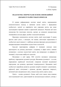 - Калюжна, Т.Г. (2014) Teaching creativity as the basis of innovation of the future teacher Сучасні інформаційні технології та інноваційні методики навчання в підготовці фахівців: методологія, теорія, досвід, проблеми (38). pp. 290-294.