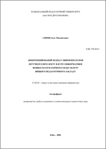 The dissertation is devoted to the possibility of individualization and intensification of the process of teaching the grounds of artificial intelligence in “Computer Science” at the Department of Physics and Mathematics of Pedagogical University; effectiveness of the formation of students’ knowledge and skills in different spheres and levels while applying the differential approach. The work contains the understanding of the essence of the differential approach to teaching “Computer Science” at a higher educational establishment, methodological demands concerning its application. Scientific grounds for the choice of the content of educational material while teaching the basics of artificial intelligence were singled out. Such a choice was based upon the logical approach towards artificial intelligence making use of Prolog, the language of logic programming. Curriculum demands of different types as for the students’ knowledge and skills were presented in the thesis. Scientifically grounded methods of differential approach implementation, which presuppose the use of various kinds and levels of theoretical tasks and practical exercises, elements of module system of teaching process with the rating knowledge control were suggested in the work. Effectiveness of the above methodology has been theoretically grounded and practically proved with the experience of teaching at the higher educational teacher training institution