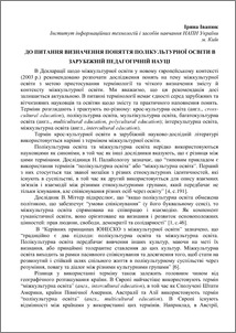- Іванюк, І.В. (orcid.org/0000-0003-2381-785X) (2014) On the question of the definition of multicultural education in foreign educational science In: Педагогічна компаративістика-2014: якісний вимір освіти зарубіжжя та український контекст.: матеріали наук.-практ. семінару (Київ, 5 червня 2014р.) . Педагогічна думка, м. Київ, Україна, pp. 48-50. ISBN 978-966-644-356-9