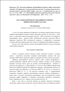 Based on findings of an empirical investigation the author analyzes in detail new trends in organizational development of higher educational institutions regarding contents and organization of training, methodical, material and organizational foundations of activity of higher educational institutions as well as distinctive features of teaching staff’s and departments’ work and students professional development.