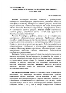 - Лапінський, В.В. (orcid.org/0000-0002-2832-4774) (2013) Електронні освітні ресурси – дидактичні вимоги і класифікація Педагогіка вищої школи: методологія, теорія, технології, 1 (3) (2 (50)). pp. 214-218.