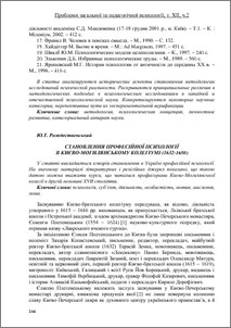 - Рождественський, Юрій Тихонович (2012) Становлення професійної психології в Києво-Могилянському колегіумі (1632-1650) Збірник наукових праць Інституту психології iмені Г. С. Костюка Національної АПН України : Проблеми загальної та педагогічної психології, 3 (XIV). pp. 264-281. ISSN 2077-2289