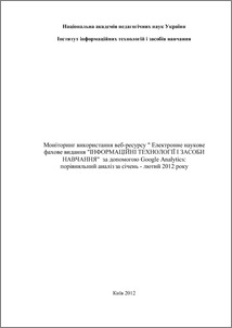 - Шиненко, М.А., Сороко, Н.В. and Ткаченко, В.А. (2012) Моніторинг використання веб-ресурсу " Електронне наукове фахове видання "Інформаційні технології і засоби навчання" за допомогою Google Analytics: порівняльний аналіз за січень - лютий 2012 року [Experiment] (Unpublished)