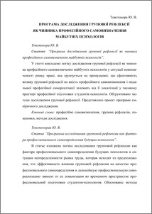 - Товстокора, Юлія Віталіївна (2013) The research program of group reflection as a factor of future psychologists professional self-determination Наукові студії із соціальної та політичної психології , 32 (35). pp. 102-111.