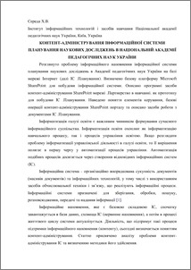 - Середа, Х.В. (orcid.org/0000-0002-4510-7173) (2012) Kontent-administration of the Informative system of planning of scientific researches in the Academy of pedagogical sciences of Ukraine In: Тези науково-технiчної конференцiї SAIT 2012 . НТУУ "КПI", pp. 410-411.