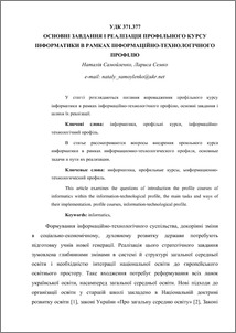 - Самойленко, Наталія Іванівна and Семко, Лариса Петрівна (2011) Основні завдання і реалізація профільного курсу інформатики в рамках інформаційно-технологічного профілю Наукові записки КДПУ ім. В. Вінниченка (98). pp. 120-123.
