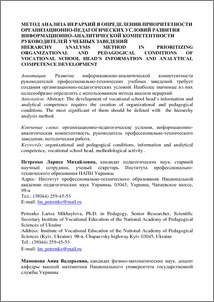 - Петренко, Лариса Михайлівна (2014) Hierarchy analysis method in prioritizing organizational and pedagogical conditions of vocational school head’s information and analytical competence development Вектор науки Тольяттинского государственного университета. Серия: Педагогика, психология, 1 (16). pp. 165-169.