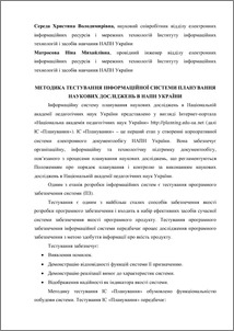 - Середа, Х.В. (orcid.org/0000-0002-4510-7173) and Матросова, Н.М. (2012) A method of testing of the informatiоn system of planning of scientific researches is in NAPN of Ukraine In: Тези доповідей звітної наукової конференції ІІТЗН НАПН України . Інститут інформаційних технологій і засобів навчання НАПН України, м.Київ, Україна, pp. 68-69.