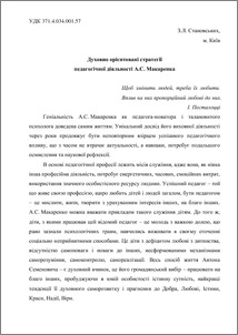 - Становських, З.Л. (2013) Spiritually oriented strategies of educational activities A.S. Makarenko In: Scientific and pedagogical legacy of Anton Makarenko in modern educational institutions . Kherson: Oldie Plus, м. Київ, Україна, pp. 247-250.
