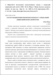- Рібцун, Юлія Валентинівна (orcid.org/0000-0002-2672-3704) (2012) Застосування компетентнісного підходу у спеціальній дошкільній освіті дітей із ОМЗ Вісник Інституту розвитку дитини, 23. pp. 115-120.