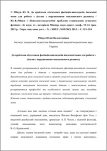 - Рібцун, Юлія Валентинівна (orcid.org/0000-0002-2672-3704) (2013) До проблеми підготовки фахівців-викладачів іноземної мови для роботи з дітьми з порушеннями мовленнєвого розвитку Психолого-педагогічні проблеми становлення сучасного фахівця, зб. наук. ст., матеріали Міжнар. наук.-практ. конф.. pp. 351-354.