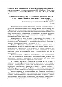 - Рібцун, Юлія Валентинівна (orcid.org/0000-0002-2672-3704) (2013) Сучасні підходи у навчанні дошкільників з порушеннями мовлення в умовах інклюзії Педагогика и психология, 1 (14). pp. 10-14. ISSN 2077-6861
