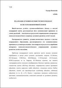 Highlights the essence of spiritual and personal approach to the system of continuous education, considered its basic principles and conditions of sale. Analyzed results of the author's psychological and pedagogical support spiritual development of children and youth.