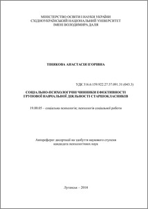 - Тінякова, Анастасія Ігорівна (2014) Social-psychological factors of effectiveness of group education activities of the seniors Dissertation candidate2 thesis, Східноукраїнський національний університет імені Володимира Даля.