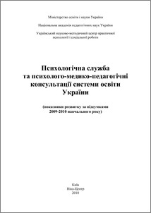 The first part of the manual includes indicators of psychological services of the education system at the end of the 2009-2010 school year. The tables show the growth of practical psychologists and social workers education as compared to the previous academic year; evidence of the educational and qualification level of specialists, the results of training and certification of personnel services; show the performance of practical psychologists and social workers with children, parents and teachers. In the second part reveals the activities of the psychological, medical and educational guidance, the statistical data on the identification and diagnostic study of children with disabilities psihofizichnogo development, analyzed the identified types of disorders in children and their prevalence and dominance in different regions of Ukraine. For the Ministry of Education and Science of the Autonomous Republic of Crimea, the education and science of regional, Kyiv and Sevastopol city state administrations, regional institutions of postgraduate education, local education authorities, principals, teachers, clinical psychologists, social workers preschool, secondary, vocational and higher educational institutions of the education system in Ukraine