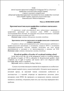 - Вовковінський, М.І. (2012) Kreativni qualities of teacher of vocational training school In: Наукове забезпечення професійної освіти і навчання (1). Інститут профес.-техн. освіти НАПН України, м.Київ, Україна, pp. 86-89.