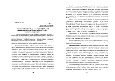 - Огієнко, О.І. (2013) Formation of readiness for innovative activity as an important component of future teacher professional training Педагогічні науки: теорія, історія, інноваційні технології, 7 (33). pp. 154-162.