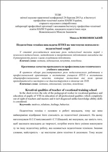 - Вовковінський, М.І. (2013) Kreativni qualities of teacher of vocational training school In: Зітна науково-практична конференція 28 березня 2013 р. в Інституті професійно-технічної освіти НАПН України (1). Інститут професійно-технічної освіти НАПН України, м.Київ, Україна, pp. 157-160.
