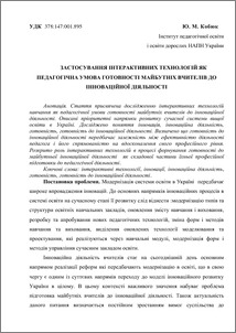 - Кобюк, Ю.М. (2014) Use of interactive technology as a pedagogical conditions readiness future teachers to innovate Педагогічні науки: теорія, історія, інноваційні технології, 4 (38). pp. 171-177. ISSN 2312-5993
