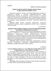 The problem of value orientations formation of future specialists in vocational education. Analysis of important methodological position, based on a study by scientists of different values philosophical schools. Author 's definition of "value orientation". Determined and solved (external and internal) conditions for the formation of value orientations of future specialists.