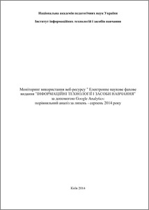 - Шиненко, М.А., Сороко, Н.В. and Ткаченко, В.А. (2014) Моніторинг використання веб-ресурсу " Електронне наукове фахове видання "Інформаційні технології і засоби навчання" за допомогою Google Analytics: порівняльний аналіз за липень - серпень 2014 року [Experiment] (Unpublished)