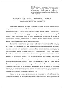 The article revealing the psychological and pedagogical conditions of realization of pedagogical skills of the teacher means the project activity. Alleged idea that professional self-realization teacher directly related to the student's personal self-realization. An example and analyzed the results of testing the creative spirit oriented project "Meeting generations".