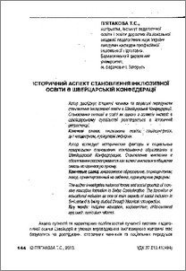 - П'ятакова, Т.С. (2013) Історичний аспект становлення інклюзивної освіти в Швейцарській конфедерації Вища освіта України у контексті інтеграції до європейського освітнього простору (VII 49). pp. 144-151.