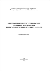 The problems of justification of the most appropriate methods and organizational forms of quality evaluation of educational software for secondary schools of Ukraine are exposed in the book. The current state of the problem of schools support with educational software, the maim trends of development of modern standards of quality evaluation of ICT are described. The main groups of indicators of quality of educational software are exposed, among them there are: psychological, pedagogical, ergonomical, technical, indicators of healthcare and safety. The methods of quality problems investigation such as: expert, expert-analytical, criterial, pedagogical experiment and other are described, the most important features of their application are revealed. Educational software certification technology is grounded, the model of software products for secondary schools quality assurance is proposed. The book is intended for educational policy makers, scholars, graduate students, teachers, professors and university students in the field of ICT.