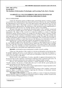 Lately, the information systems of different types, particularly systems to manage scientific research, have been widely introduced into education and science. However, the ways of optimizing the implementation of such systems as well as the improvement of their effectiveness have not been adequately studied. That is why further research is needed for possible ways of improving the information systems implementation. The effectiveness of the information systems implementation is largely dependent on the presence of a "friendly" interface system, on its usability. The goal of the paper is to determine the theoretical aspects of the "usability" concept and to study how the usability improves the efficiency of information systems in scientific research management. The subject of this research is to study the usability as a means of improving information systems efficiency using as an example the information system to manage scientific research at the National Academy of Pedagogical Sciences of Ukraine. This paper examines the main approaches to the evaluation of information systems usability. The paper also describes the testing of information system usability in research management. The research made it possible to conclude that the usability is a factor that increases the efficiency of an information system and allows potential users to better understand, organize and summarize business processes. Although the application of the principles of usability is a promising direction, it is one of the little studied problems in the Ukrainian systems engineering. The detailed study of usability basic rules will allow developers of information systems to create better products with "friendly" interfaces. These rules will help users better understand the content of newly created information resources and therefore will facilitate their implementation and usage.