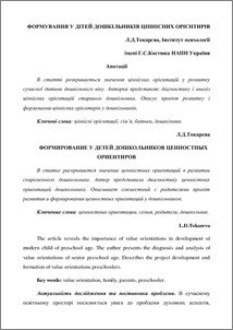 - Токарєва, Людмила Дмитріївна (orcid.org/0000-0002-8162-6544) (2014) Формування у дітей дошкільників ціннісних орієнтирів Актуальні проблеми психології. Т. 4. Психологія розвитку дошкільника, 10. pp. 252-264. ISSN 2072-4772