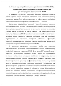 - Кубська, Лариса Іванівна (2011) Упровадження інформаційно-комунікаційних технологій в управлінську діяльність керівників ПТНЗ In: Сучасні освітні технології у професійній підготовці майбутніх фахівців . ЛНПЦ, м. Львів, Україна, pp. 138-140.