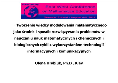 - Гриб'юк, О.О. (2014) Tworzenie wiedzy modelowania matematycznego jako środek i sposób rozwiązywania problemów w nauczaniu nauk matematycznych i chemicznych i biologicznych cykli z wykorzystaniem technologii informacyjnych i komunikacyjnych In: West Conference on Mathematics Education What STEAM-based approach can bring into mathematics education, EWCOME 2014, 4-8 August 2014, Warszawa, Polska. (Unpublished)