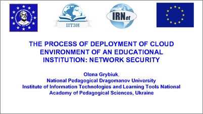 - Гриб'юк, О.О. (2014) The process of deployment of cloud environment of an educational institution: network security. In: International Scientific-conference “Innovations in higher education and dissemination of the initial results of the research on the law, ethical, technical, social factors of ICT developments, e-learning and intercultural developments in different countr, June 25, 2014 , м.Дніпродзержинськ, Україна. (Unpublished)