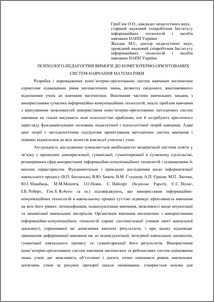 - Гриб'юк, О.О. and Жалдак, М.І. (2014) Психолого-педагогічні вимоги до комп’ютерно-орієнтованих систем навчання математики In: Звітна наукова конференція Інституту інформаційних технологій і засобів навчання НАПН України . Інститут інформаційних технологій та засобів навчання НАПН України, м.Київ, Україна.