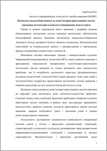 - Гриб'юк, О.О. (2013) Psychological and pedagogical requirements of computer-oriented mathematics learning in the context of improving the quality of education Higher Education of Ukraine in the context of integration to European Educational Spase , 4 (46). pp. 110-123. ISSN 978-966-8840-94-4(4)