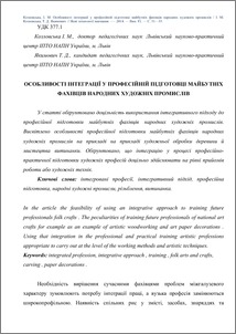 - Якимович, Т. Д. and Козловська, І.М. (2014) Features integration in the professional training of future specialists of folk arts and crafts Нові технології навчання, 5 (81). pp. 31-35.