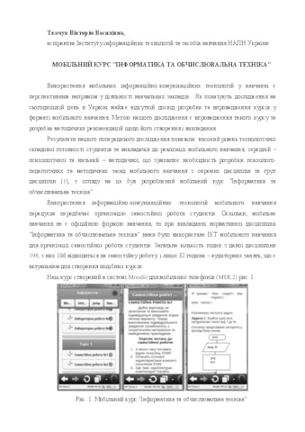 - Ткачук, В. В. (2013) Mobile course "Informatics and Computer Science" In: Звітна наук. конф. Інституту інформаційних технологій і засобів навчання НАПН України . ІІТЗН НАПН України, м. Київ, Україна, pp. 156-157.