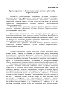 Specifies the content of the psychological categories of spirituality, spiritual values, define the stages of spiritual development of the individual. Updated issue of psychological diagnosis value orientations of high school students and offers the author's method of diagnosis of formation of spiritual values seniors "Wishes."