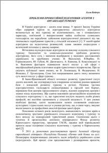 - Бойчук, Алла (2014) Проблеми професійної підготовки агентів з організації туризму In: Матеріали звітної науково-практ. конф. за 2013 р. : «Науково-методичне забезпечення професійної освіти і навчання» (24-25 берез. 2014 р., м. Київ). Т. 2. . ІПТО НАПН України, м. Київ, Україна, pp. 71-73.