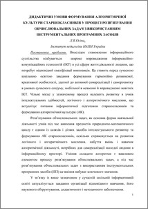 - Осіпа, Людмила Володимирівна (2011) Didactic conditions of algorithmic culture formation in high school students’ at solving computational problems using software tools Проблеми сучасного підручника (11). pp. 594-600. ISSN 978-966-644-204-1