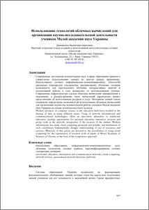 Сучасні досягнення комп'ютерних наук в сфері освіти призвели до спільного використання даних у багатьох різних сховищах. Використання мережних інформаційно-комунікаційних технологій пропонує новаторську альтернативу традиційному навчанню, створюючи можливості для персонального навчання, інтерактивних занять і колективної роботи в мережі незалежно від місце-знаходження учня. Сучасна інфраструктура зробила хмарні обчислення захищеними і надійними, а поширення таких обчислень кардинально змінює уявлення про використання ресурсів і послуг. Матеріали даної статті присвячені визначенню можливостей використання хмарних обчислень для організації науково-дослідної роботи учнів Малої академії наук України на основі компетентнісного підходу.