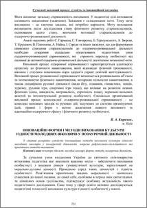 - Киричок, В.А. (2013) Innovative forms and methods of education culture esteem of young pupils in after-hour activities In: Сучасний виховний процес: сутність та інноваційний потенціал матеріали звіт. наук.-практ. конф. Ін-ту проблем виховання НАПН України за 2012 рік (3). НАІР, м.Івано-Франківськ, Україна, pp. 221-224.